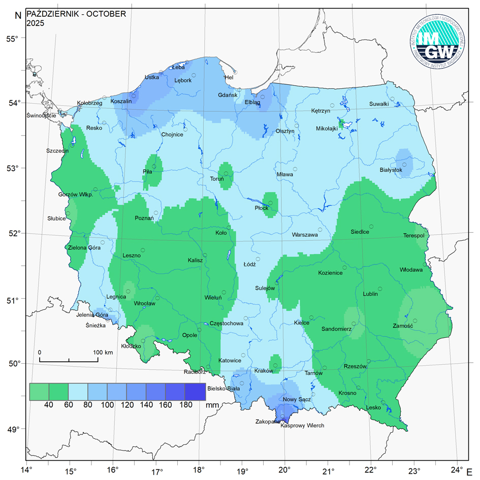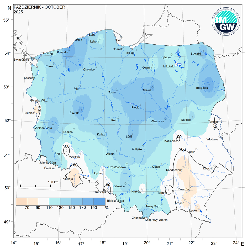 Według klasyfikacji rangowej średniej obszarowej sumy opadów, obejmującej okres od 1951 r., październik 2025 r. plasuje się na 18. pozycji. Najbardziej zasobny w opady był październik 1974 r. (ze średnią sumą 162,7 mm), najmniej – w 1951 r. (zaledwie 1,8 mm). Rozkład przestrzenny sum opadów w październiku 2025 r. był słabo zróżnicowany, przekraczając normę na przeważającym obszarze kraju. Najwyższe sumy miesięczne (powyżej 120 mm) odnotowano na Kasprowym Wierchu oraz na stacjach synoptycznych w Koszalinie i Ustce. Z kolei najniższe opady, poniżej 30 mm, wystąpiły w Zamościu, Kłodzku i Słubicach. W stosunku do średniej wieloletniej (1991-2020) opady w październiku 2025 r. zawierały się pomiędzy 89,6% normy na stacji synoptycznej w Lesku, a 122,1% normy na stacji synoptycznej w Kołobrzegu.