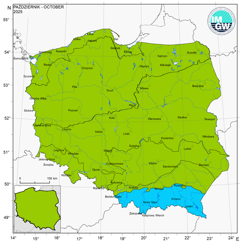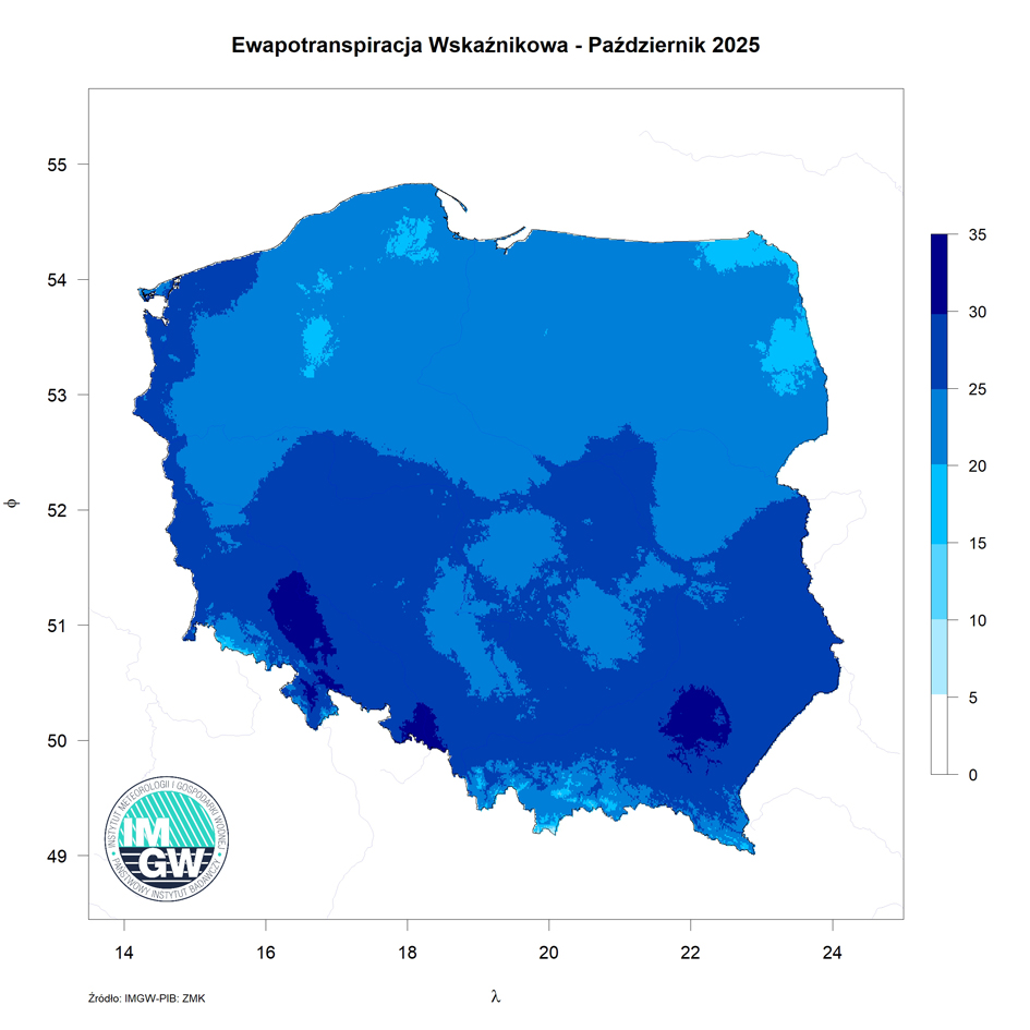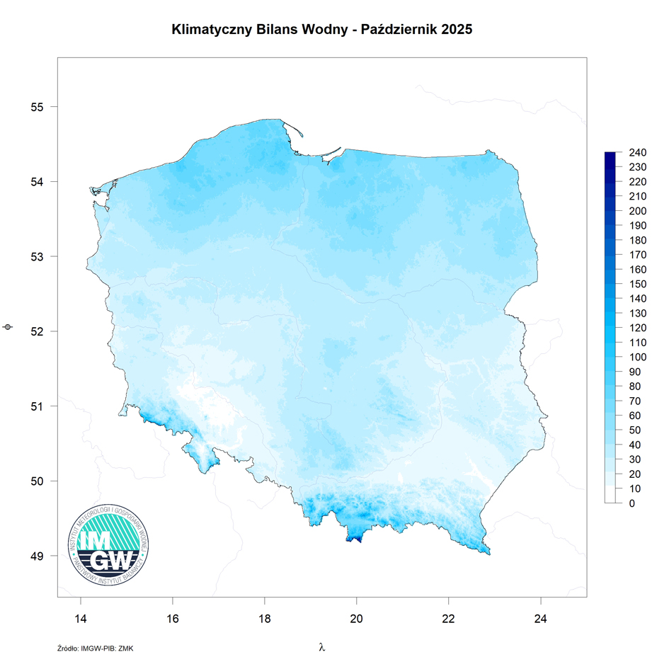 Niezwykle ciekawych informacji dostarcza nam analiza parowania potencjalnego, obliczanego na podstawie standardowych danych meteorologicznych, jak również klimatycznego bilansu wodnego (KBW), będącego różnicą pomiędzy wysokością opadów a wielkością parowania. W październiku 2025 r. najwyższe wartości parowania, osiągające 35 mm wystąpiły w okolicach Rzeszowa. Najniższe wartości odnotowano na północy i północnym-wschodzie oraz na obszarach górskich (szczególnie w Tatrach). Klimatyczny bilans wodny w październiku był dodatni w całym kraju. Rozkład przestrzenny wartości miał charakter południkowy. Najniższe wartości (bliskie 0 mm) odnotowano na południu kraju (nie wliczając obszarów górskich). Wartości dodatnie odnotowano na północy Polski oraz w górach (wysokich partie Tatr oraz w Beskidach).