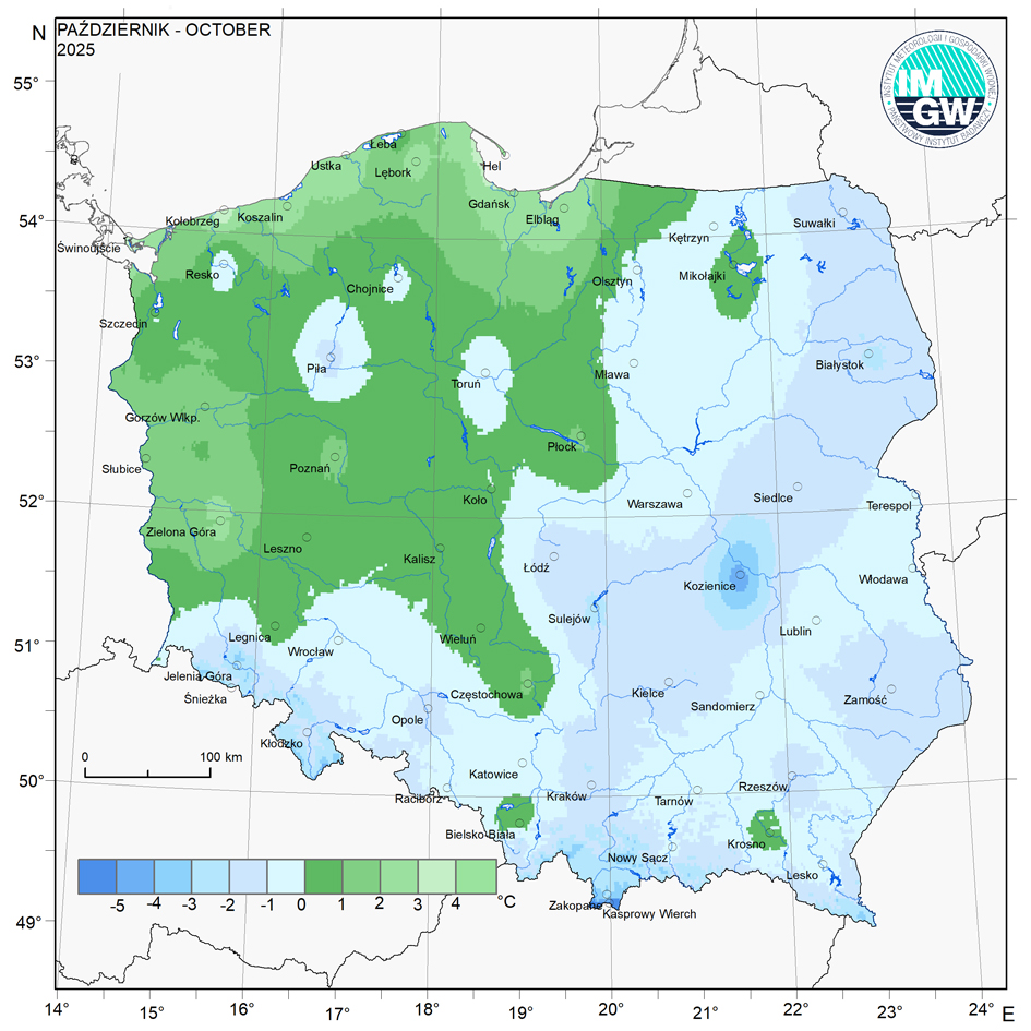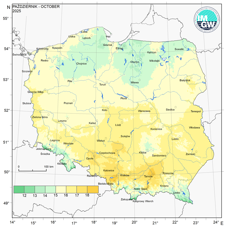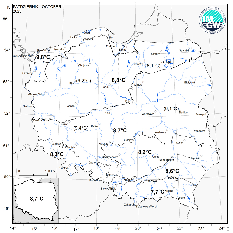 Średnia obszarowa temperatura powietrza w październiku 2025 r. wyniosła w Polsce 8,7°C i była o 0,1 stopnia niższa od średniej wieloletniej dla tego miesiąca (klimatologiczny okres normalny 1991-2020). Tegoroczny październik należy zaliczyć do miesięcy normalnych pod względem termicznym. Najcieplejszym regionem Polski był pas pobrzeży, gdzie średnia obszarowa temperatura powietrza wyniosła 9,8°C (wyższa o 0,4 stopnia od normy), najchłodniejszym – Karpaty, ze średnią 7,7°C (0,7 stopnia poniżej normy).