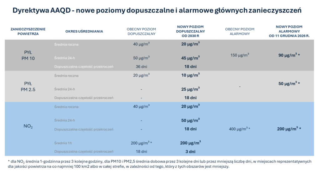 W tym roku państwa członkowskie UE przystępują do wdrażania zmian wynikających z przyjętej dwa lata temu przez Komisję Europejską aktualizacji Dyrektywy w Sprawie Jakości Powietrza (AAQD, Ambient Air Quality Directive). Wartości norm i poziomów alarmowych zanieczyszczeń pyłowych i gazowych zostaną zaostrzone zgodnie z zaleceniami WHO, a zakres monitorowania substancji szkodliwych w powietrzu rozszerzony.
