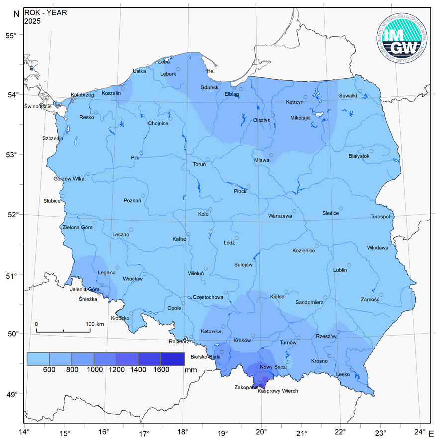 Według klasyfikacji rangowej średniej obszarowej sumy opadów, obejmującej okres od 1951 r., ubiegły rok plasuje się na 56. pozycji. Najbardziej zasoby w opady był 2010 r. (ze średnią obszarową sumą opadów 804,1 mm, co stanowiło 132% normy), najmniej – 1982 r. (z sumą zaledwie 422,6 mm, 69% normy). Roczne sumy opadów w 2025 r. wyniosły od poniżej 420 mm do ponad 1000 mm. Najwyższe wartości odnotowano w Tatrach, natomiast najniższe na stacjach synoptycznych w Terespolu, Warszawie i Sandomierzu. Przestrzenne zróżnicowanie rocznych sum opadu w 2025 r. w odniesieniu do normy wieloletniej (1991-2020) wskazuje, że zawierały się one w przedziale od 71,3 proc. normy w Kłodzku do 121 proc. normy w Gdańsku.