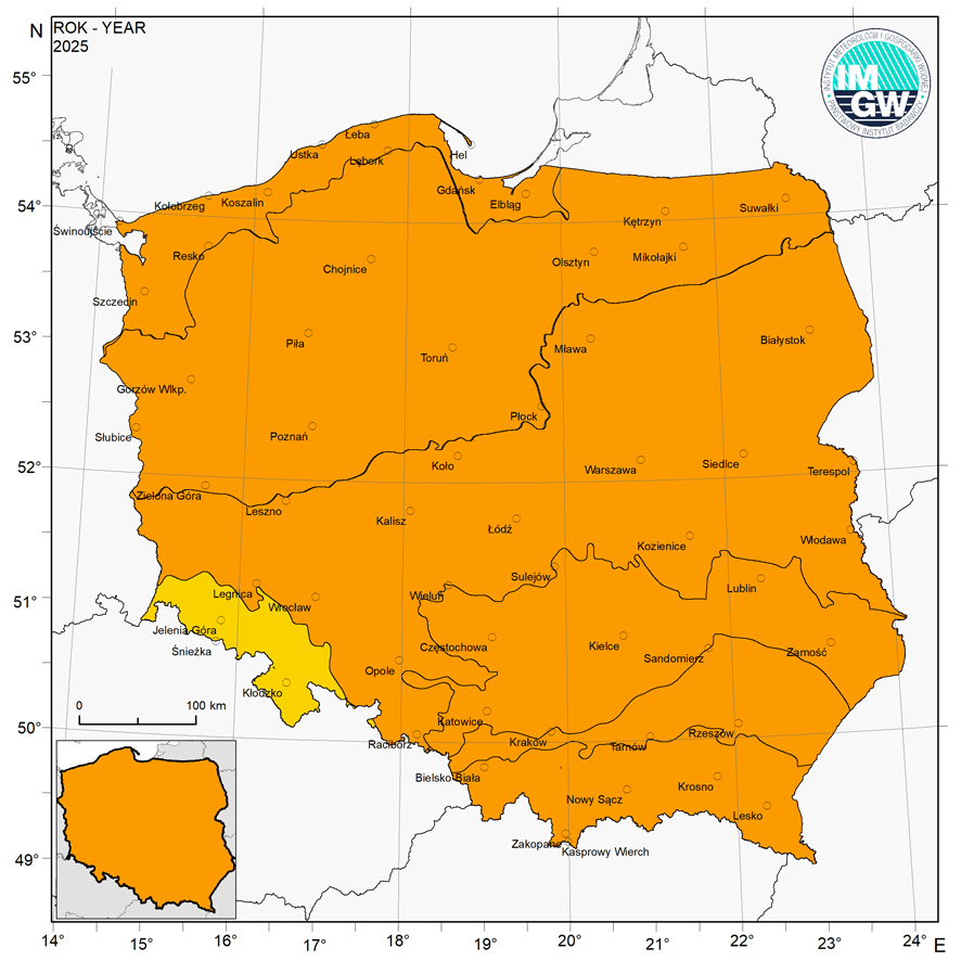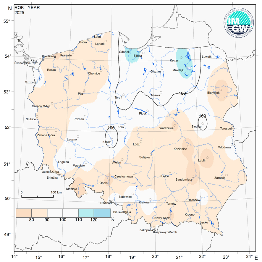 Obszarowo uśredniona suma opadu atmosferycznego w 2025 r. wyniosła w Polsce 546 mm, co stanowiło 89,31 proc. normy określonej na podstawie pomiarów w latach 1991-2020. Według klasyfikacji Kaczorowskiej miniony rok należy zaliczyć do lat suchych.