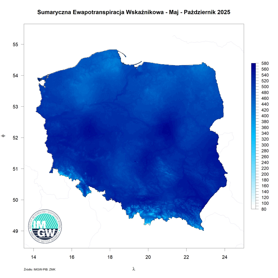 Przedstawione pomiary ewapotranspiracji wskaźnikowej (ET0) pokazują wielkość potencjalnej utraty wilgoci z powierzchni gruntu w okresie od maja do października (okres wegetacyjny). Obszary o silnej utarcie wilgoci można zaobserwować w przeważającej części kraju, szczególności w centrum, na południowym wschodzie oraz w pasach przedgórzy. Porównanie zmienności tego wskaźnika z przestrzennym rozkładem opadów pozwala wyznaczyć Klimatyczny Bilans Wodny, który obrazuje występowanie obszarów, gdzie we wspomnianym okresie wegetacyjnym (V-X) 2025 r. możliwe było występowanie suszy glebowej.