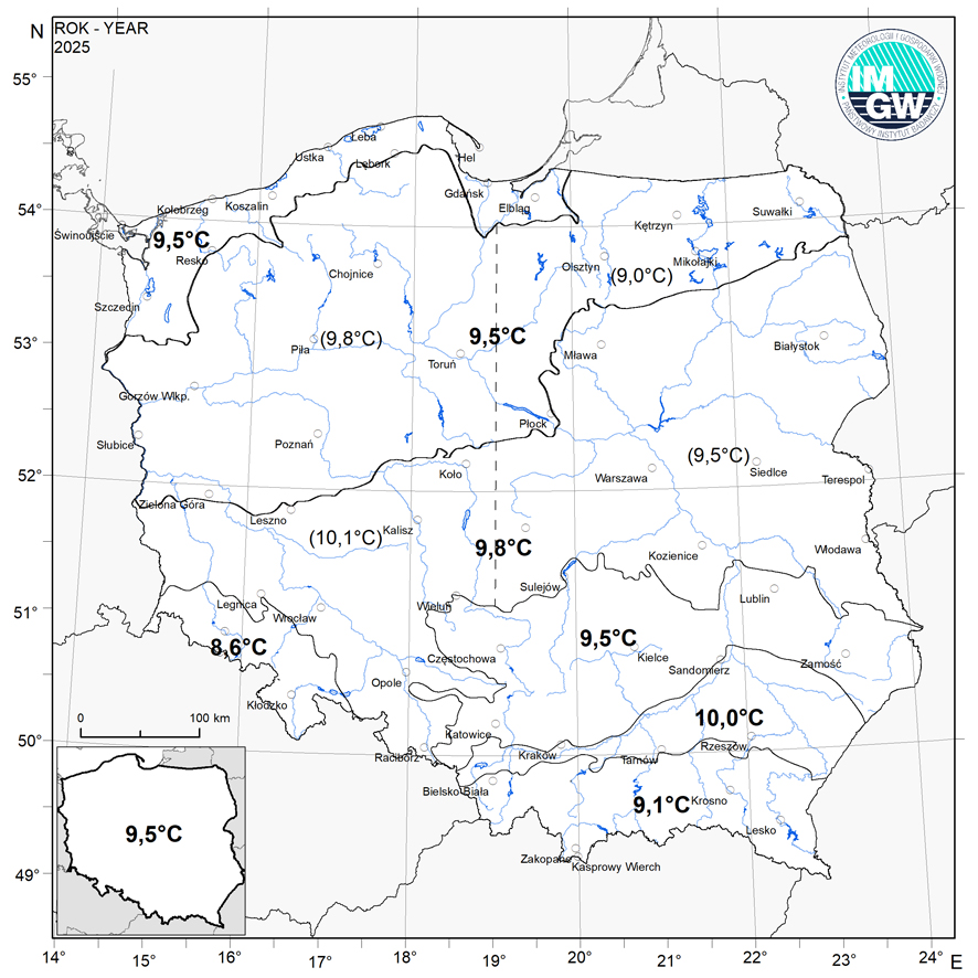 Średnia obszarowa temperatura powietrza w 2025 r. wyniosła w Polsce 9,5°C i była o 0,8 stopnia wyższa od średniej rocznej wieloletniej (klimatologiczny okres normalny 1991-2020). Ubiegły rok należy zaliczyć do lat bardzo ciepłych. Najcieplejszym regionem było Podkarpacie, gdzie średnia obszarowa temperatura powietrza wyniosła 10,0°C i była wyższa od normy dla tego obszaru o 1,0 stopnia. Najchłodniejszym regionem były Sudety – tam średnia roczna temperatura wyniosła 8,6°C (0,5 stopnia powyżej normy). Jeśli spojrzymy na obszar Pojezierzy i Nizin, z uwzględnieniem podziału wzdłuż południka 19°E, to wyraźnie widać zróżnicowanie warunków termicznych w zachodnich i wschodnich częściach obu największych regionów Polski – różnica średnich wartości rocznych wyniosła odpowiednio 0,8 i 0,6 stopnia. Zachodnia część Pasa Nizin była w 2025 r. najcieplejszym regionem kraju – średnia roczna temperatura powietrza wyniosła tam 10,1°C.