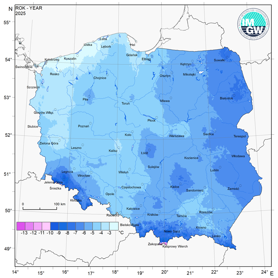 Przestrzenne zróżnicowanie temperatury powietrza w skali rocznej pokazuje, że wartości średniej rocznej temperatury powietrza na całym obszarze Polski malały od zachodu i południowego zachodu w kierunku północnym i północno-wschodnim. Najchłodniejszym obszarem w skali całego 2025 r. były północne (obszar od Chojnic po Lębork) i północno-wschodnie rejony Polski (Suwałki i okolice), a także wyższe partie obu pasm górskich. Najniższe wartości średniej rocznej temperatury powietrza wystąpiły w Suwałkach i Jeleniej Górze (8,4°C, odpowiednio o 1,2 i 0,3 stopnia powyżej normy) i Zakopanem (7,2°C, cieplej o 1,0 stopnia w stosunku do normy). Średnia roczna temperatura powietrza na stacjach wysokogórskich wyniosła 1,2°C na Kasprowym Wierchu (1,1 stopnia powyżej normy) i 2,4°C na Śnieżce (0,9 stopnia powyżej normy). Najcieplej było w południowo-zachodniej i zachodniej części kraju – najwyższe wartości średniej rocznej temperatury powietrza wystąpiły na stacjach we Wrocławiu i Słubicach (10,5°C, o 0,8 stopnia powyżej normy w obu miastach) oraz na stacjach synoptycznych w Tarnowie (11,3°C, o 1,0 stopień powyżej normy) oraz Warszawie (10,3°C, o 1,3 stopnia powyżej normy).